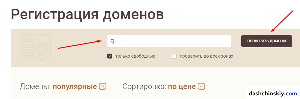 Сейчас рассмотрим, как проверить доступность домена для регистрации (он может быть куплен уже до вас и тогда придется придумать другое имя).