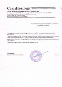 Благодарим за оперативную и профессиональную работу по продвижению нашего сайта novtorg.by. За время сотрудничества, Дащинский Александр Юрьевич, показал высокий уровень знаний и качества. Все услуги предоставлялись точно и в срок, с соблюдением деловой этики и человеческой выдержки, и понимания. За год мы достигли хороших позиций в поисковых системах и вышли на новый уровень. Надеемся на дальнейшее плодотворное сотрудничество.