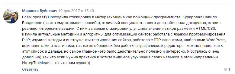 Всем привет) Проходила стажировку в «ИнтерТехМедиа» как помощник программиста. Курировал Савило Владислав (за что ему огромное спасибо), отличный специалист своего дела, объяснял доходчиво, ставил реально интересные задачи.