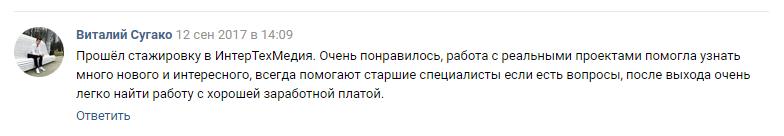 Прошёл стажировку в «ИнтерТехМедиа». Очень понравилось, работа с реальными проектами помогла узнать много нового и интересного, всегда помогают старшие специалисты если есть вопросы, после выхода очень легко найти работу с хорошей заработной платой.