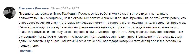 Если Вы все еще сомневаетесь стоит ли стажироваться в «ИнтерТехМедиа» мой ответ очевиден – ДА! Дерзайте! Все обязательно получится! Спасибо за ценный опыт и поддержку! Удачи Вам и компании «ИнтерТехМедиа»!